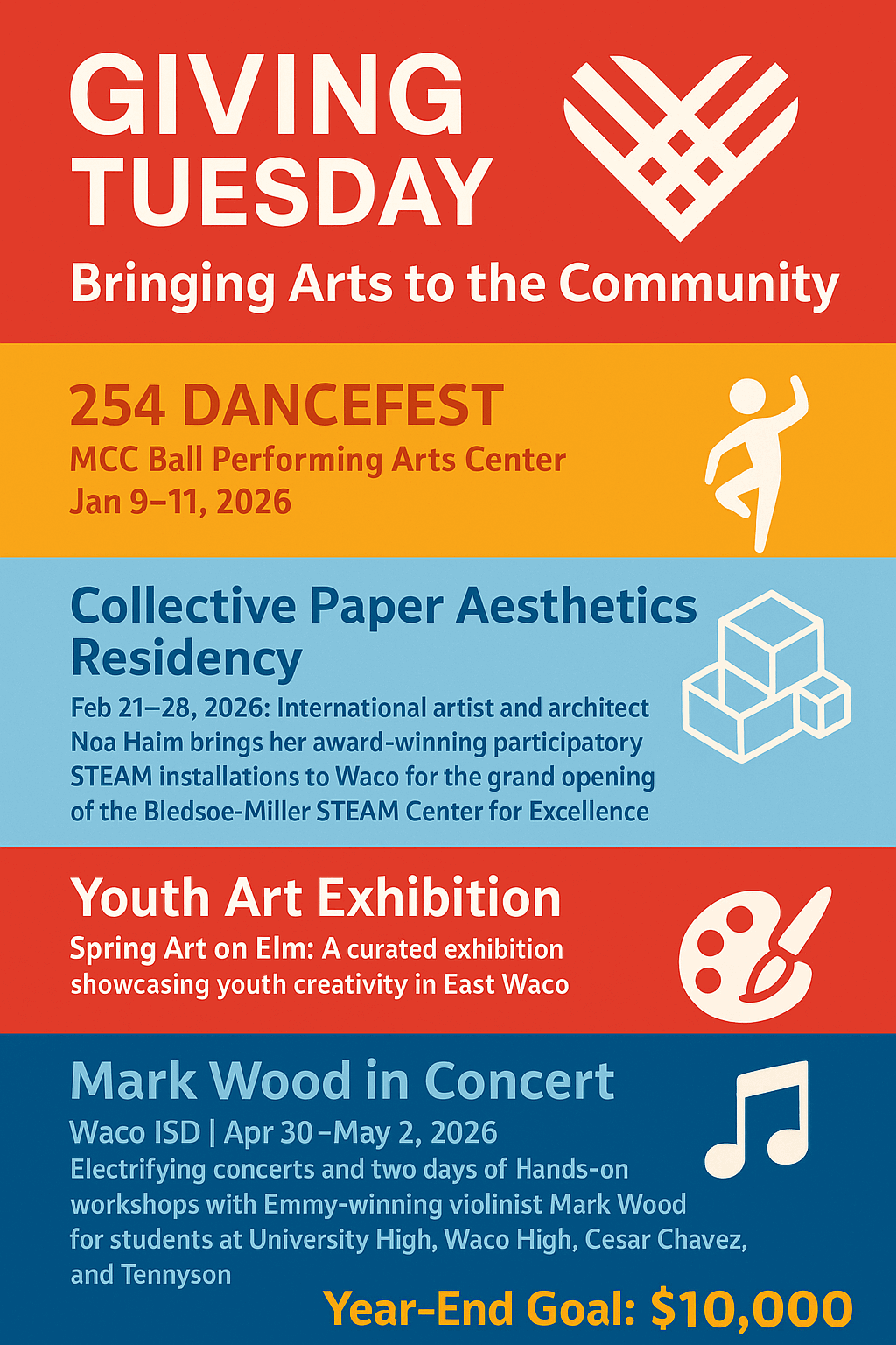 Established in 2004, Waco Cultural Arts Fest dba Cultural Arts of Waco is a 501(c)(3) nonprofit committed to fostering unity, opportunity, and artistic excellence for all members of our community. We believe in celebrating creativity, individual achievement, and shared American values that bring people together.